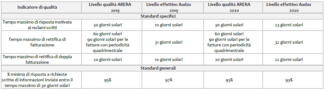 Ogni società di fornitura deve poter garantire un call center, ossia un servizio di assistenza telefonica, il cui numero sia facilmente rintracciabile sia sulle bollette che sul sito stesso della società di fornitura. Indipendentemente dal numero di linee attive per il call center, l'ARERA ha stabilito che almeno una delle linee attivate debba essere un numero verde, ossia un numero che può essere contattato in maniera gratuita se chiamato da rete fissa (vedi sezione RICHIEDI INFORMAZIONI e RIFERIMENTI DI CONTATTO nella presente pagina). Oltre ai diversi recapiti telefonici o ad altre modalità per contattare il Servizio Clienti, il fornitore deve riportare in maniera chiara gli orari e i giorni in cui il servizio è attivo. Per garantire la massima tutela ai consumatori, inoltre, l'ARERA ha disposto che ogni 6 (sei) mesi i servizi offerti dai call center vengano analizzati tramite indagini sulla soddisfazione dei clienti. In tal modo sarà possibile valutare il rispetto delle normative definite dall'ARERA stessa e stilare delle graduatorie, disponibili presso il sito ARERA, tramite le quali si potranno comprendere la qualità dei servizi offerti dai diversi fornitori. Per le società che violano gli standard di assistenza definiti dall'ARERA sono previste sanzioni amministrative che variano a seconda del tipo di violazione. Nella tabella sopra sono riportati gli standard specifici stabiliti dall’ARERA e i livelli effettivi raggiunti da Audax nell’anno 2020.
