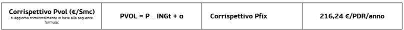 Il prezzo della materia prima gas naturale è pari alla somma due componenti PFIX e PVOL (IVA e imposte escluse), determinate liberamente dal venditore e compressivo dei costi relativi diverse attività svolte dal venditore per la commercializzazione e fornitura del gas naturale al cliente finale non già coperti della spesa per la distribuzione misura e commercializzazione e della spesa relativa al servizio di trasporto del gas. La componente PFIX, che rappresenta la componente espressa in quota punto di riconsegna (€/PDR/anno), indipendente dai consumi fatturati, è pari al valore sotto riportato e fissa e invariabile per 12 mesi dalla data di attivazione della fornitura. La componente PVOL (€/Smc) è definita in ogni trimestre solare ed è pari a: